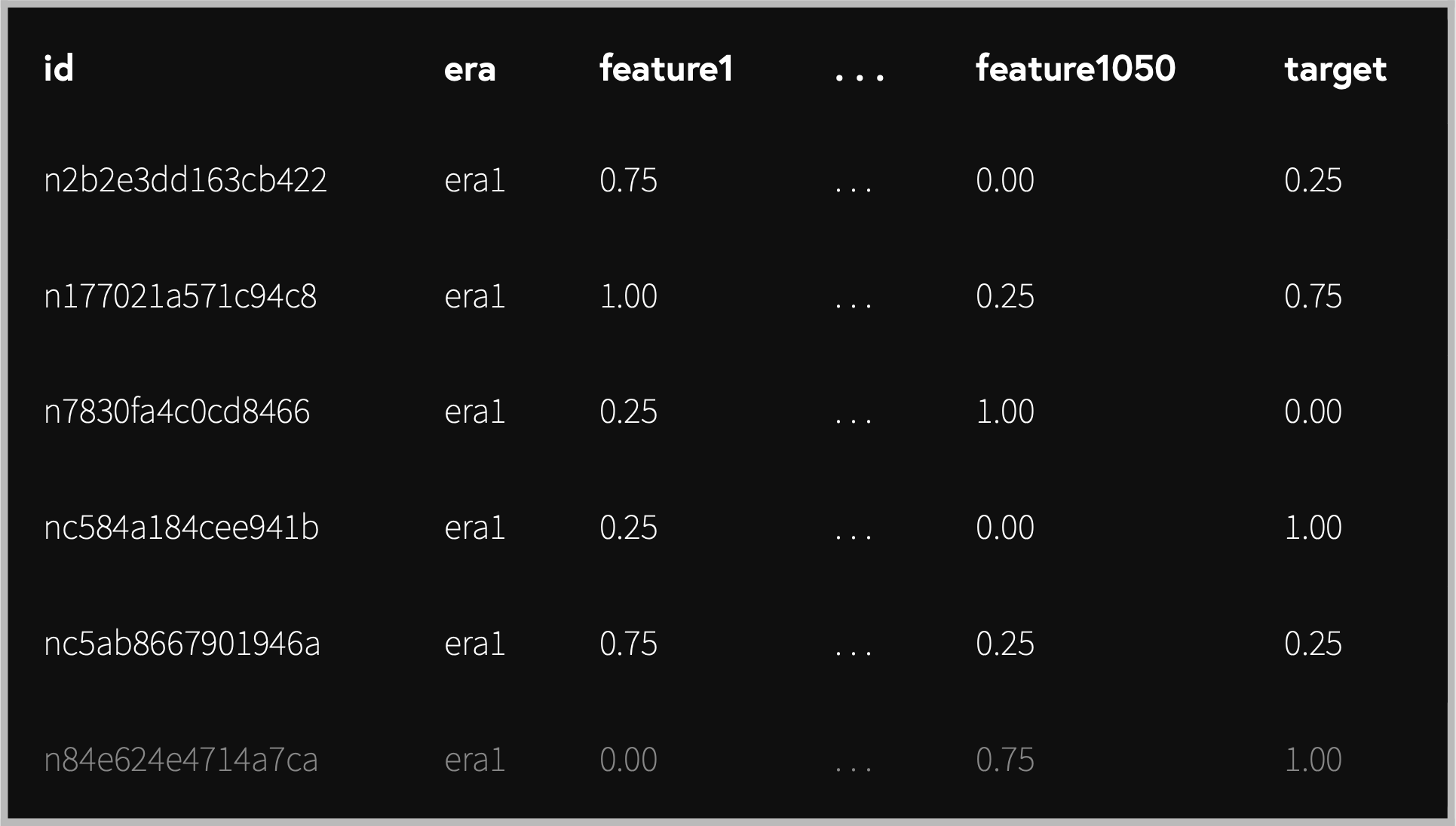 Each id corresponds to a stock at a specific time era. The features describe the various quantitative attributes of the stock at the time. The target represents an abstract measure of performance a fixed number of weeks into the future